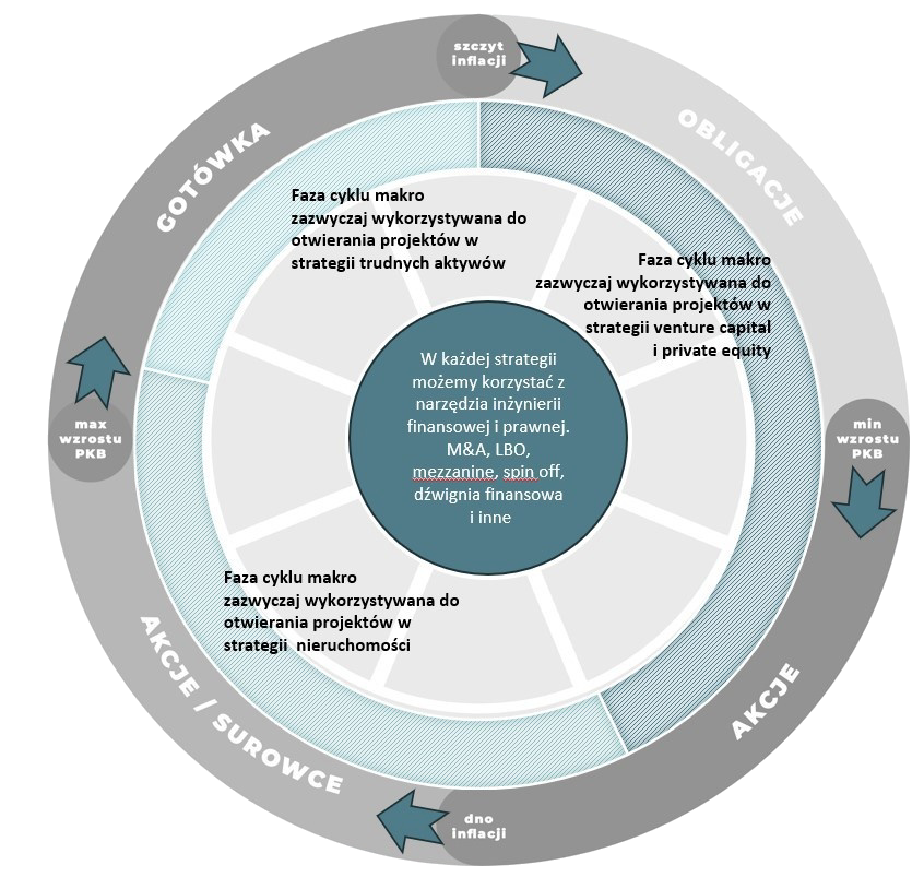 Aby mitygować wpływ ryzyka systemowego* w działalności i odnajdywać okazje do inwestycji niezależnie od momentu w cyklu koniunkturalnym, AL’THOR AFI stosuje odpowiednie, odmienne strategie inwestycyjne dostosowane do każdej fazy cyklu koniunkturalnego.